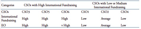 The behavior of CSO6 shows signs of proactiveness, innovativeness, and risk propensity, and its EO is therefore considered high. The fact that a small CSO, with almost no formal structure, accessed an IDA and raised funds, in addition to affecting the education level of the entire population that it serves, is evidence of proactiveness. As it assumed high level commitments, including raising matching funds, and achieving bold goals, it showed signs of risk taking. Therefore, we classified its EO as high. The funds raised show that its level of international fundraising should also be considered high.
