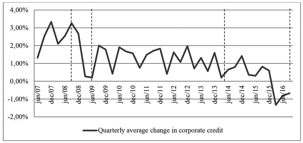 Starting mainly from the variations in the credit supply to determine the crisis quarters investigated in this study, the 2008 crisis involves the period between the fourth quarter of 2008, considered the milestone of the subprime crisis with the fall of Lehman Brothers, cited as the beginning of the crisis by CODACE (Business Cycle Dating Committee), and the second quarter of 2009, given the slowdown in credit levels Brazil over that period, as shown in Figure 1. The crisis of 2015 comprises the period between the second quarter of 2014, considered the initial milestone of the crisis by CODACE, and the third quarter of 2016, which captured the steep decrease in economic activity in Brazil in this period along with the credit balance contraction, from then on, as seen in Figure 1.