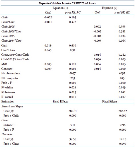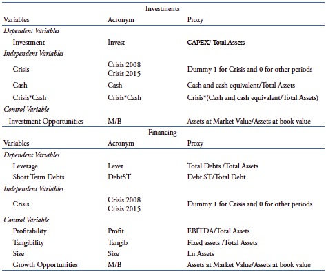 where Invest represents the Investments, Crisis is the crisis dummy, Crisis*Cons, Crisis2008*Cons and Crisis2015*Cons represent dummies from the 2008 and 2015 crisis for the constrained firms dummy. The variables of each crisis and the financial constraint dummy were interacted with the cash (in t-1). M/B represents the investment opportunities in the period t. As for the study of models of financing of firms on crisis impacts are as follows: