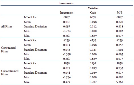 Analyzing all companies, the quarterly average investment is 1.6%. When analyzing the samples of constrained and unconstrained companies, we observed that the average investment of unconstrained firms (1.9%) is larger than constrained firms (1.4%). We also note that the cash levels of the constrained and unconstrained companies are not considerably different, 9.8% and 9.9%, respectively. Regarding investment opportunities, as represented by the market-to-book, constrained firms presented higher means than unconstrained firms.