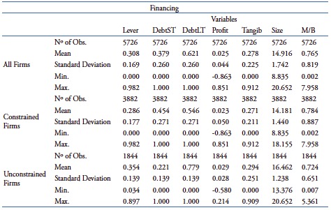We adopted descriptive analysis and panel data analysis as our methodological tools. In the models, dummies were included for the constrained group of firms, and unconstrained firms were taken as the basis for the regression model, as adopted by Aldrighi and Bisinha (2010). In other words, the companies included in the regression showed their differential in relation to unconstrained firms, which are those that were unconstrained in the 2008 crisis that remained unconstrained in the 2015 crisis.