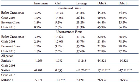 Table 4 shows the evolution of the main variables of this study, analyzing the behavior of companies segregated into constrained and unconstrained before the 2008 crisis, in the 2008 crisis, between the 2008 and 2015 crises, and in the 2015 crisis. To analyze whether the differences in means are statistically significant, the mean differences test (t-test) was applied.