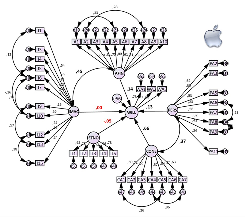 Regarding a country’s influence on willingness to buy, the results differ depending on the brand. For Apple, country affinity had a positive and statistically significant result (WILL ← AFIN = .14; p = .01), which did not happen for the other two brands. On the other hand, country image (IMAG) had no effect on willingness to buy (WILL) for any of the brands. This fact may suggest that the COO has no direct effect on the Younger Millennials willingness to buy global brands.