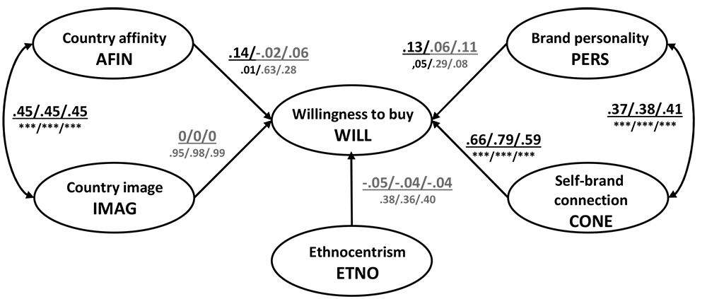 The correlation between country image and country affinity (IMAG ↔ AFIN = .45, p <0.001, for the three brands) is in line with Nes et al., (2014), whose scale included both cognitive (country image) and affective aspects (country affinity).