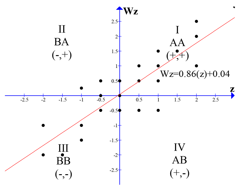 One way to interpret Moran’s statistics I is through his scatter diagram. According to Figure 1, it presents, in the Cartesian plane, the standardized value (z) of the variable x for each of the units in the abscissa and, in the ordinate, the average of the standardized value of the same variable for the neighbors of this unit wz. The diagram is complemented by the representation of a regression line whose slope indicates the value of Moran’s I, which, for the example of Figure 1, is 0.86. Thus, the greater the slope of the line relative to the horizontal axis, the greater the value of spatial autocorrelation and vice versa.