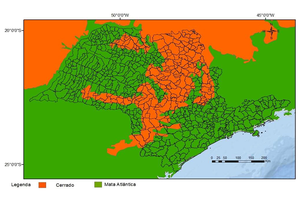 As observed in Figure 2, in the state of São Paulo there are two biomes: Atlantic Forest and Cerrado. According to Maffei (2010), of the 645 municipalities of the state, 176 are part of the Cerrado and 469, of the Atlantic Forest.