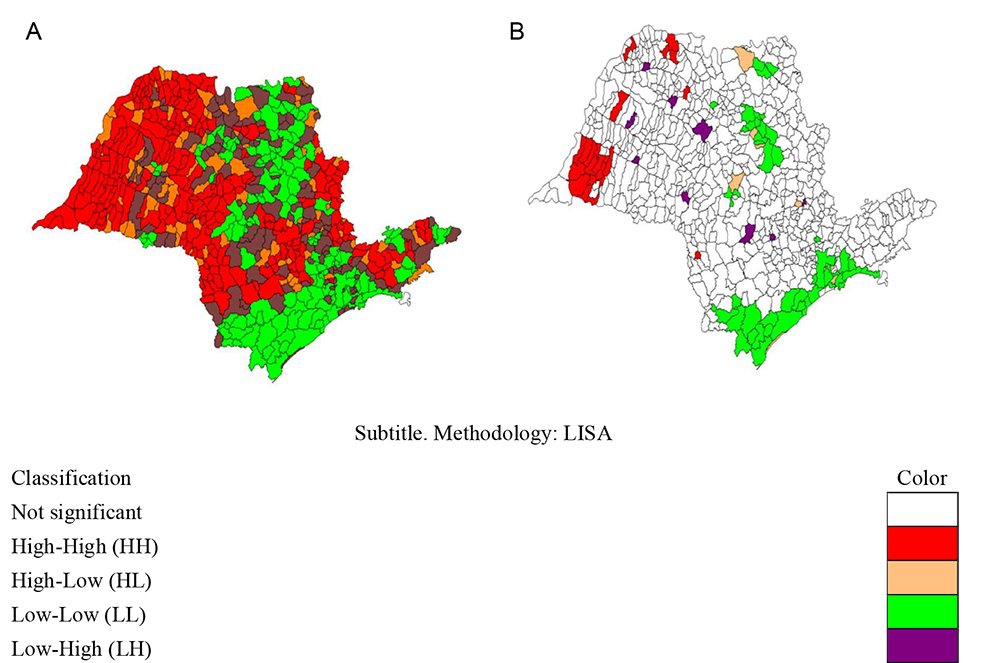 Based on the local Moran index, two large significant LL-type clusters and one HH-type cluster were also found. The first of the LL type is located in the Paulista South Coast, Itapetininga and Metropolitana mesoregions of São Paulo and the other in the Ribeirão Preto and Araraquara mesoregions. The cluster type HH is located in the Presidente Prudente mesoregion.
