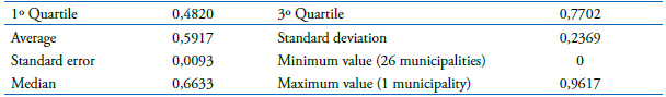 It is also worth mentioning that some precautions should be taken in the results found. The tools used, like any other, have limitations. On one hand, the spatial analysis was performed by municipalities, which precludes identifying infra-municipal heterogeneity at the level of productive ownership. On the other, as explained by Rosano-Peña and Daher (2015), data envelopment analysis, being a deterministic technique and estimating relative indexes concerning best practices, is very susceptible to the data used. This means that the results are conditional on the units evaluated, the variables used in the work and the principle that all other factors involved are identical. Adding or deleting units and variables may derive other results.