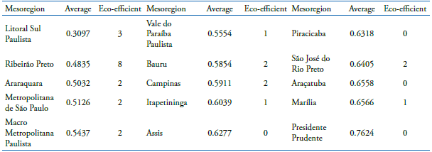 Table 2 also reveals the performance of the mesoregions. These results identify the Paulista South Coast as the most eco-efficient region and Presidente Prudente and Marília as the most eco-inefficient. These three mesoregions are part of the Atlantic forest biome. It is also observed that Ribeirão Preto, in the Cerrado, is the macroregion with the largest number of eco-efficient municipalities, with approximately 31% of the benchmark municipalities of São Paulo.