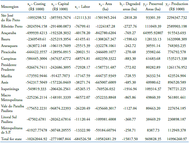 To carry out this research, information was taken from the agricultural census conducted in 2006 (Brazilian Institute of Geography and Statistics [IBGE], 2010), since data from the latest census (2017) are not available. For the 645 municipalities of São Paulo, the classic inputs and outputs of agricultural production were considered, but one innovation was the incorporation of a positive and a negative externality. As in most cases (Gomes, 2008), the inputs used in modeling were: x1 - workforce on properties in number of people; x2 - capital estimated by depreciation (10% of the value of fixed assets); x3 - total area of establishments in hectare; x4 - other current expenses incurred by producers, called costing. Outputs consider three types of products: y1 - desirable product - the total value of production; y2 - environmental desirable product - areas of natural forests and forests preserved on hectare properties; b1 - environmental undesirable product - areas of degraded land on hectare properties (census does not include abandoned land).
