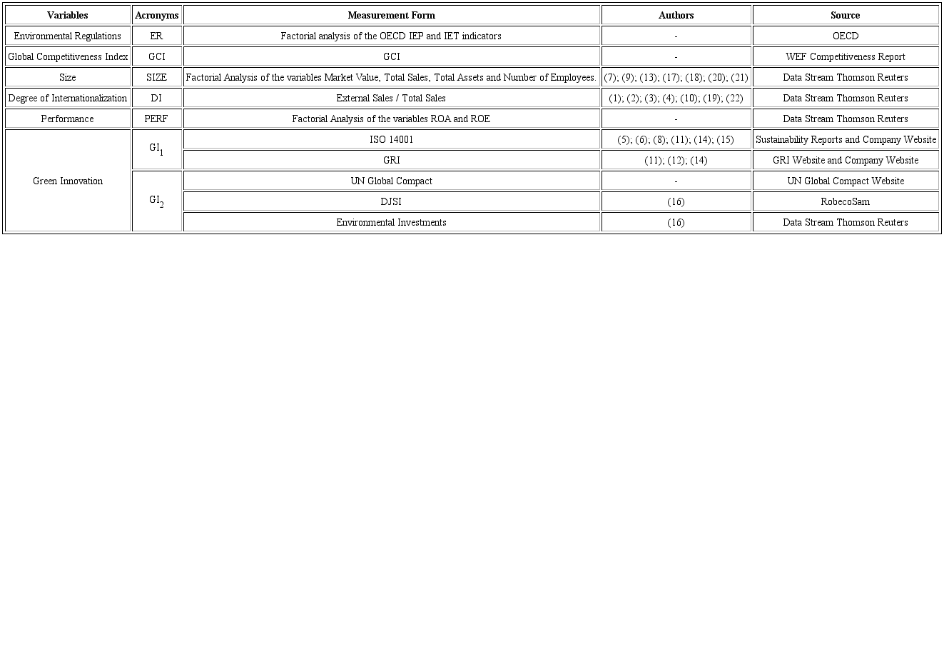 Size and Internationalization: The size of the companies analyzed in the study was composed of four different dimensions: Market Value, Total Sales, Total Assets and Number of Employees. These measures were combined and, based on factor analysis, a factor was generated to measure the size of the companies. This variable is widely used by several authors who have shown that the size of companies sometimes interferes with the conditions for the development of Green Innovation (Lustosa, 2002; Sueyoshi & Goto, 2009; Weng et al., 2015; Jakobsen & Clausen, 2016; Amores-Salvadó et al., 2015; Souza et al., 2016).