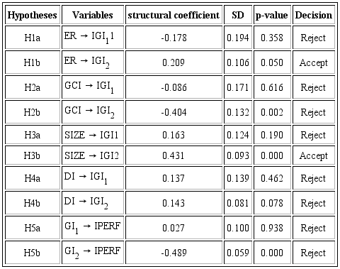 Ascertaining the relationships between the variables demonstrated by the structural coefficients, it was found that four relationships showed statistical significance (p < 0.05). The relationship between the ER and GI2 constructs (coefficient 0.209; p = 0.05) is significant and confirmed the H1b hypothesis. Likewise, the relationship between SIZE and GI2 (coefficient 0.431; p = 0.000) also showed statistical significance, corroborating the Hb3 hypothesis. The relationship between GCI and GI2 (coefficient -0.404; p = 0.002), despite having presented statistical significance, demonstrated a negative relationship and did not confirm H2b. As well as the relationship between GCI and GI2, the relationship between GI2 and PERF was statistically significant, however, GI2 had a negative impact on the companies’ PERF (coefficient -0.489; p = 0.000) without confirming H5b.