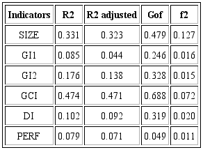 R2 > 0.25), and small values for the DI, GI1 and PERF (adjusted R2 > 0.04), confirming the low explanatory power of latent variables in GI1 and DI. In addition to evaluating these values, two other indicators were considered to verify the quality of the model’s fit, effect size (f2) and Gof. According to Hair et al., (2005), f2 assesses how each construct is useful for adjusting the model. Table 4 shows that all constructs did not present values greater than 0.35, representing a small effect for the general adjustment of the model.