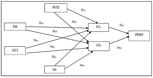 As the data used to measure the companies’ Green Innovation effort generated two factors (GI1 and GI2), all the relationships between the variables environmental regulations, competitiveness, size, degree of internationalization, and performance were performed with construct GI1 and construct GI2 separately.