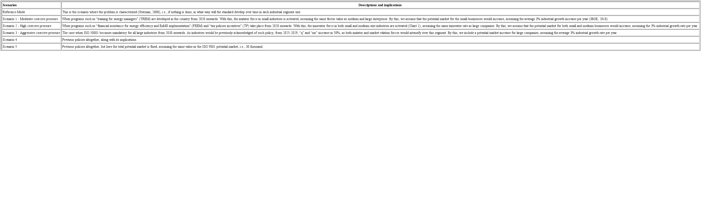 Given the timid initial uptake of ISO 50001 certification in Brazil (ISO, 2017), we examine the influence that more coercive forces may have on its adoption. Moreover, we investigate how these additional stakeholder pressures, through government policies and incentives, could make an impact on different industries size. Several countries have been under different policies that seem to have a positive outcome regarding the number of enterprises certified by the standard (McKane et al., 2017). Thus, the scenarios assessed would affect different industrial sizes, with the inference that national programs would take place. Chart 2 presents each scenario along with its descriptions and implications in the model.