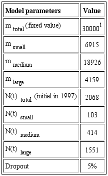 The initial number of adopters, Ntotal , is a known number. However, some assumptions were made for the initial numbers for each segment size. Different weight was attributed, that is: 75%, 20% and 5% of the initial Ntotal for large, medium and small industries, respectively (Table 1). The dropout rate is the average rate when considering all years since 1993. This dropout exists because market economic uncertainties, such as financial crises, may directly distort the attitude of companies towards environmentally friendly actions. Also, there may be changes in managerial or market strategies, making it unattractive to allocate resources for management systems.