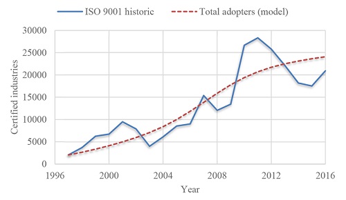 Many authors have shown that an organization’s adoption of ISO 9001 predicts the ISO 14001 behavior as well (Baek, 2017; Darnall, 2006; Delmas & Montes-Sancho, 2011). In addition, lessons from the operation any of these management systems can also be reproduced in other standard (Stevens, Batty, Longhurst, & Drew, 2012). Two factors stand out for the dissemination of ISO 50001 in eight of the twelve countries with the highest number of certifications, namely the use of renewable energy sources and the previous adoption of the standards. ISO 90001 and ISO 14001 (Lira, et al., 2019) . That is, the trend in countries with low ISO 50001 certifications, as in the case of Brazil, is that the growth of this standard is driven by the adoption of older standards (as ISO 9001 and ISO 14001), in the timeline observed by the researchers. From this rationale, we assume that ISO 50001 will potentially follow a similar trend as ISO 9001 through time. Moreover, ISO 14001 has fewer historical data, thus, we focused on finding diffusion parameters from the QMS increase and use them for the EnMS diffusion.