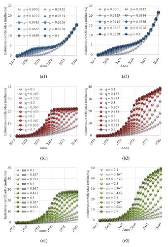 It is noticeable that when considering a variation in the potential market, the results of certified companies are more expressive, surpassing the initial market of 30 thousand for some values of q and mr. This difference is significant: for an imitation factor of 0.7, there are approximately 25 thousand certified companies considering a fixed potential market (b1), against nearly 40 thousand certified companies when considering variable potential market (b2) by 2040. The same is true for the case of mr = 0.7: an adoption of almost 30 thousand companies when the market is fixed (c1) and nearly 50 thousand certified companies when there is a growing market (c2).