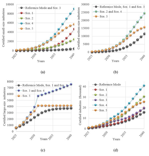 Figure 4 presents the potential number of industries certified with ISO 50001 by each size segment and in the total number of adopters per scenario. As expected, the reference mode provided the lowest result through time, with little over 15 thousand industries by 2040. With similar expectance tendency, the highest result did come from scenario 4, when all policies took place, with over 40 thousand certifications. For better visualization, the time horizon chosen for size-segment results were from 2025 onwards. Table 3 provides the percentage difference between each result from the reference mode in 2040.