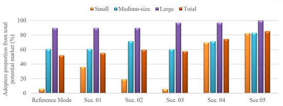 Finally, scenario 5 presents results in which all policies are considered but with a constant potential market. Thus, in Figure 4, its results show an S-shape (except in the case of Figure 4c) behavior until 2040, representing a near end of its diffusion. Nevertheless, if this analysis approach is considered, a total of 25 thousand industries would be certified by 2040 (4d), nearly 5 thousand behind its total potential market and after approximately 30 years of diffusion (2011-2040). Figure 5 presents the proportion market achieved by ISO 50001 certification in each segment size and total results in each scenario. If stakeholders’ coercive pressures persist low in boosting energy management strategies, the potential adopters achieved is approximately half from the potential market (reference mode) by 2040. This points out to the urgency of additional national policies and incentives.