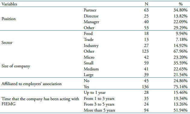 The profile of the companies and the respondents can be described in the following way: almost half of those approached exercise managerial positions in their respective companies, 35.4% being partners and another 14% directors. Of the total, 49.1% of the companies have been acting with FIEMG for more than 5 years. In addition, 75.1% of the respondents stated that their companies were affiliated to some employers association (Table 1).