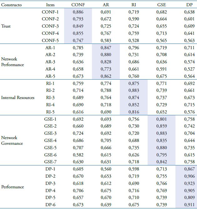 The reliability of the constructs worked was measured by means of the Cronbach Alpha (CA) and the Composite Reliability (CR). Following the proposal of Tenenhaus et al. (2005), in this research all the indicators CA and CR were greater than 0.70 indicating the reliability of the constructs. It should be further pointed out, that all the constructs were unidimensional, as they did not present any second eigenvalue greater than 1 and had AVEs greater than 0.5, indicating convergent validation, as presented in Table 3.