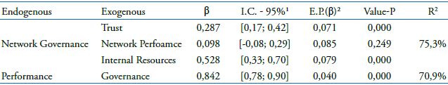 Regarding the task of checking the impact of network governments on the performance, of the companies involved, the presupposition was adopted that the new forms of governance, like NG, can be considered important elements for obtaining competitive advantages in the grouping. So that this objective was fulfilled as the existence was confirmed of significant (p-value=0.000) and positive (β=0.842 [0.78; 0.90]) influence of Network Governance on Performance, in other words, the greater the Network Governance, the greater the Performance, confirming Hypothesis 4 raised in this study. It should be mentioned further that the above indicator succeeds in explaining 70.9% of the variability of the Performance.