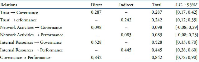 Considering the effectiveness of the NGE, observing more deeply, the significant (p-value=0.000) and positive influence of trust (β=0.287 [0.17; 0.42]) and internal resources (β=0.528 [0.33; 0.70]) on the NGE can be noted, in this way confirming hypothesis 2, which proposes that trust among the bodies forming the network has a positive relationship with network governance - and hypothesis 3 that the internal resources of the network entity influence positively network governance. So, the greater and better the trust and internal resources, the better the NGE.