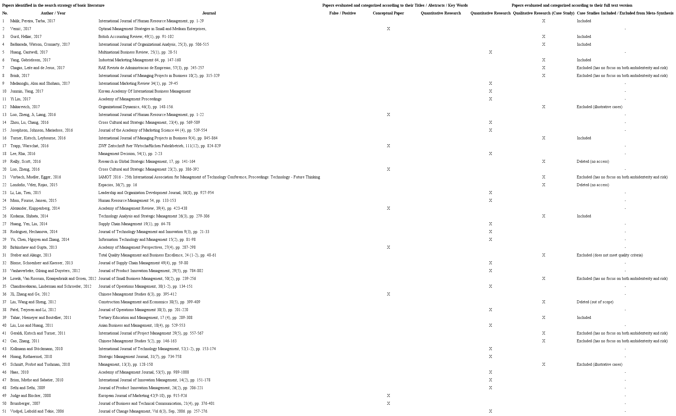 Second, we sought to select the sample by identifying relevant risk publications and organizational ambidexterity, following the recommendations by Hoon (2013). An exhaustive search of published literature helped prevent the exclusion of important information. The use of search strings in the title, abstract, and keywords were: risk AND ambidext*; uncertaint* AND ambidext*, and risk AND exploration AND exploitation. Therefore, the three forms of research, during the period ranging from 1991 to 2017, were employed in 3 different places of the search. The three databases used were Scopus, EBSCO and Web of Science. The year 1991 was chosen as the initial point of search because this was the year in which March (1991) developed an argument and established theoretical foundations for the development of organizational ambidexterity with the dualities of exploration and exploitation. The search resulted in 51 contributions published in international and national journals and conferences, as presented in Appendix A.