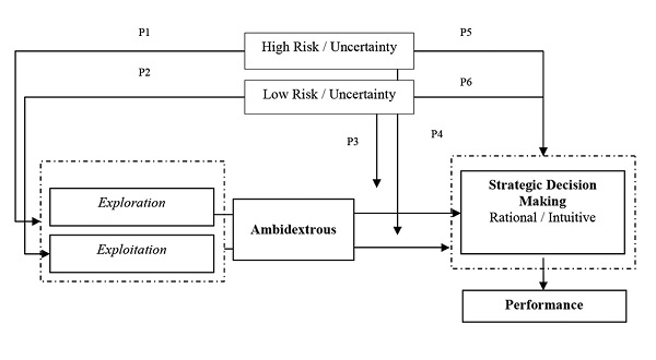 The framework of this paper suggests that exploration and exploitation capabilities, as well as risk, influence the managerial decision-making process (Eisenhardt & Zbaracki, 1992). We define decision making in two dimensions, being rational and intuitive (Dane & Pratt, 2007; Shrode & Brown, 1970).