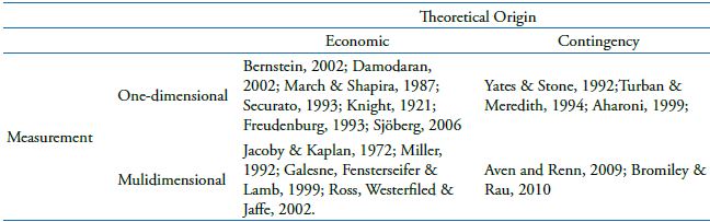 As can be seen from the concepts presented, the definition of risk is quite broad in the literature. In order to systematize the risk construct, Table 2 presents a conceptual classification that divides the studies into four dimensions: being two as to the theoretical origin and two as to its measurement.
