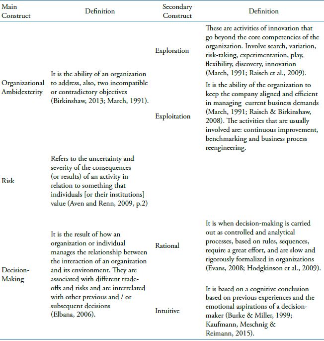 Risk, in organizational studies, has several related definitions (Hopkin, 2018). One definition is that it can be understood as the degree of uncertainty of an organizational action (Zinn, 2017). Organizational ambidexterity, in turn, is defined as the capacity of the organization to act, equally, with two objectives which are incompatible or contradictory (Birkinshaw & Gupta, 2013). The association between both constructs is possible since the company, having two capacities (e.g. exploration and exploitation), which involve the organizational ambidexterity, can assume higher or lower levels of the risk of the operation and influence its performance.