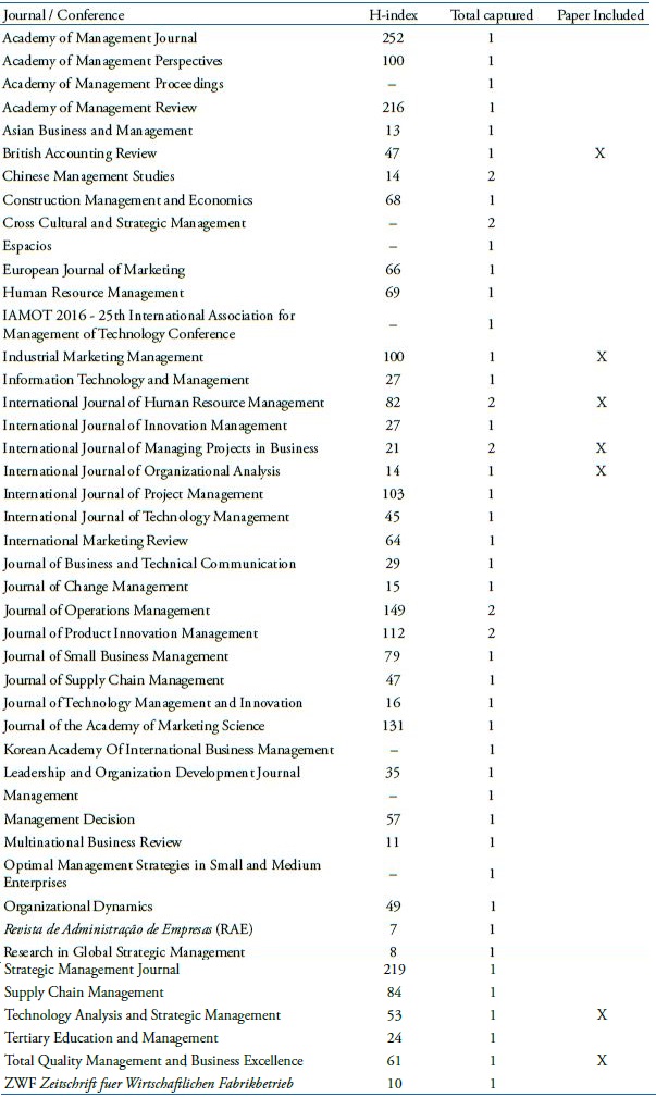 After researching the main concepts related to ambidexterity and risk in the Scopus, EBSCO and Web of Science databases, we found a sample of 51 articles published in 45 journals from various areas of knowledge (Table 4). The studies deal with diverse subjects and varied areas of Applied Social Science in the period from 1991 to 2017. The H index of the respective journal is according to Scimago Journal & Country Rank. Some journals do not have an H-index and are classified as not available (“-”).