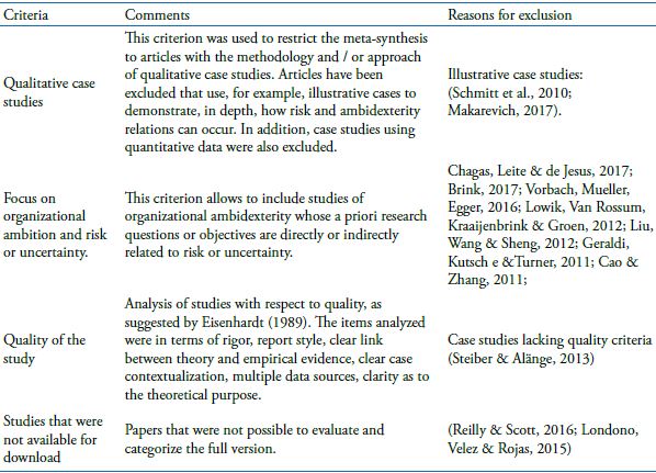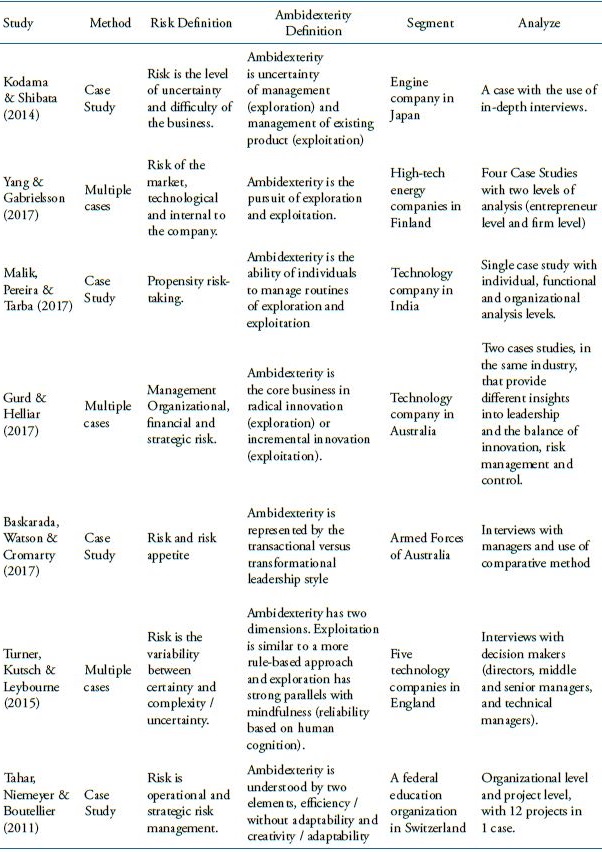 The main criterion for the exclusion of the case study is the lack of interaction / integration of the risk with the organizational ambidexterity. If the text contained elements of only one of the two constructs without the relation, one proceeded for exclusion (see Table 5). The second criterion for exclusion is the lack of use of the case study as a qualitative methodology. Therefore, we discarded quantitative research such as that by Zhou et al. (2016). The third criterion for exclusion is the interaction of risk with ambidexterity in a theoretical / conceptual way as in the text by Makarevich (2017), the study was not used, because our focus is the empirical data. After exclusion of non-relevant texts that did not show a relationship with the research question of this study, the final sample consisted of 7 articles from qualitative case studies.