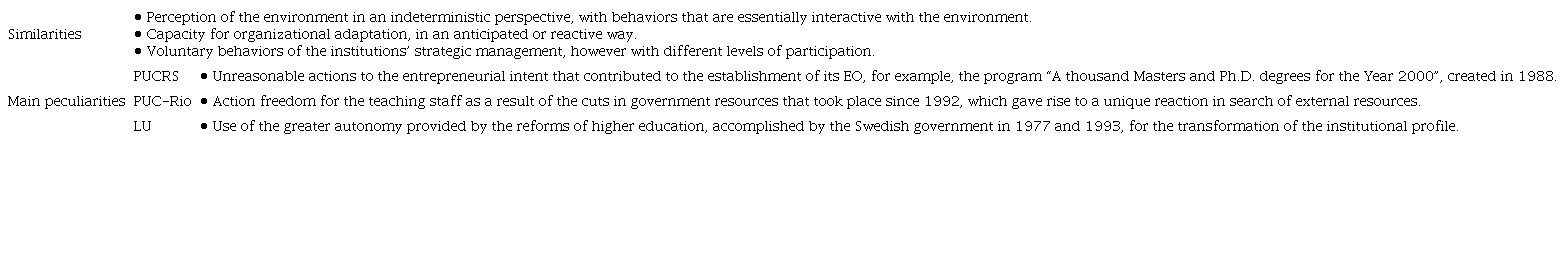 In the three studied cases, the strategic management presented elements that are joined in the indeterministic perspective of the environment, as discussed by Bignetti and Paiva (2002), Child (1972, 1997), Lewin and Volberda (1999), and Miles et al. (1978), able to adapt the organization to the environmental influences as well as to influence the surrounding environment. In an early way, or as a response to environmental changes, the behaviors carried out by the studied universities revealed important organizational adaptability, as recommended by Hodgson (2013) and Lewin and Volberda (1999). Inertia or organizational passivity gave way to voluntaristic behaviors, endowed with volition (Bignetti & Paiva, 2002; Clark, 2004, 2006) and supported by the strategic or managerial choice, according to Child (1972, 1997) and Miles et al. (1978).