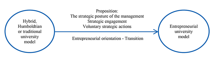 In short, the strategic position advocated here does not mean a top-down approach, but the direct, engaged, and active involvement of the university’s strategic management in the decisions inherent to the changes towards the entrepreneurial ideal, including through the definition of specific institutional policies for this purpose. In this perspective, the following theoretical proposition is presented: the EO in the university is established through the strategic posture of the management in an engaging way, and through strategic actions of voluntarist nature, supported in the non-deterministic perspective of the environment, which provide the institutional transformation. This idea is depicted in Figure 1.