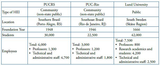 Based on the research strategy designed through multiple case studies, three cases were investigated: two in Brazil and one in Sweden. In Brazil, the two univeristies chosen as the research subjects were the Pontifícia Universidade Católica do Rio Grande do Sul (Pontifical Catholic University of Rio Grande do Sul, PUCRS) and Pontifícia Universidade Católica do Rio de Janeiro (Pontifical Catholic University of Rio de Janeiro, PUC-Rio). Tecnopuc (PUCRS’ Science and Technology Park) was elected in 2016 and 2009 as the best technology park of Brazil. Raiar, the business incubator of PUCRS, was elected in 2014 as the best incubator of companies oriented to the generation and intensive use of technologies by the National Association of Entities Promoting Innovative Enterprises (Anprotec, 2018). In the case of PUC-Rio, the most striking indicator, and also object, of this study refers to the capacity of fundraising from industry, ranking 29th among universities worldwide in the edition 2019 (THE, 2018). About 50% of the institution’s revenues originate from research projects and collaboration with private companies and government (PUC-Rio Innovation Agency [AGI], 2016), which is uncommon in the Brazilian context.