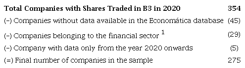 Table 1 presents the total number of companies in this sample, according to the exclusion criteria, evidencing the number of companies removed from the final sample and the exclusion reason.