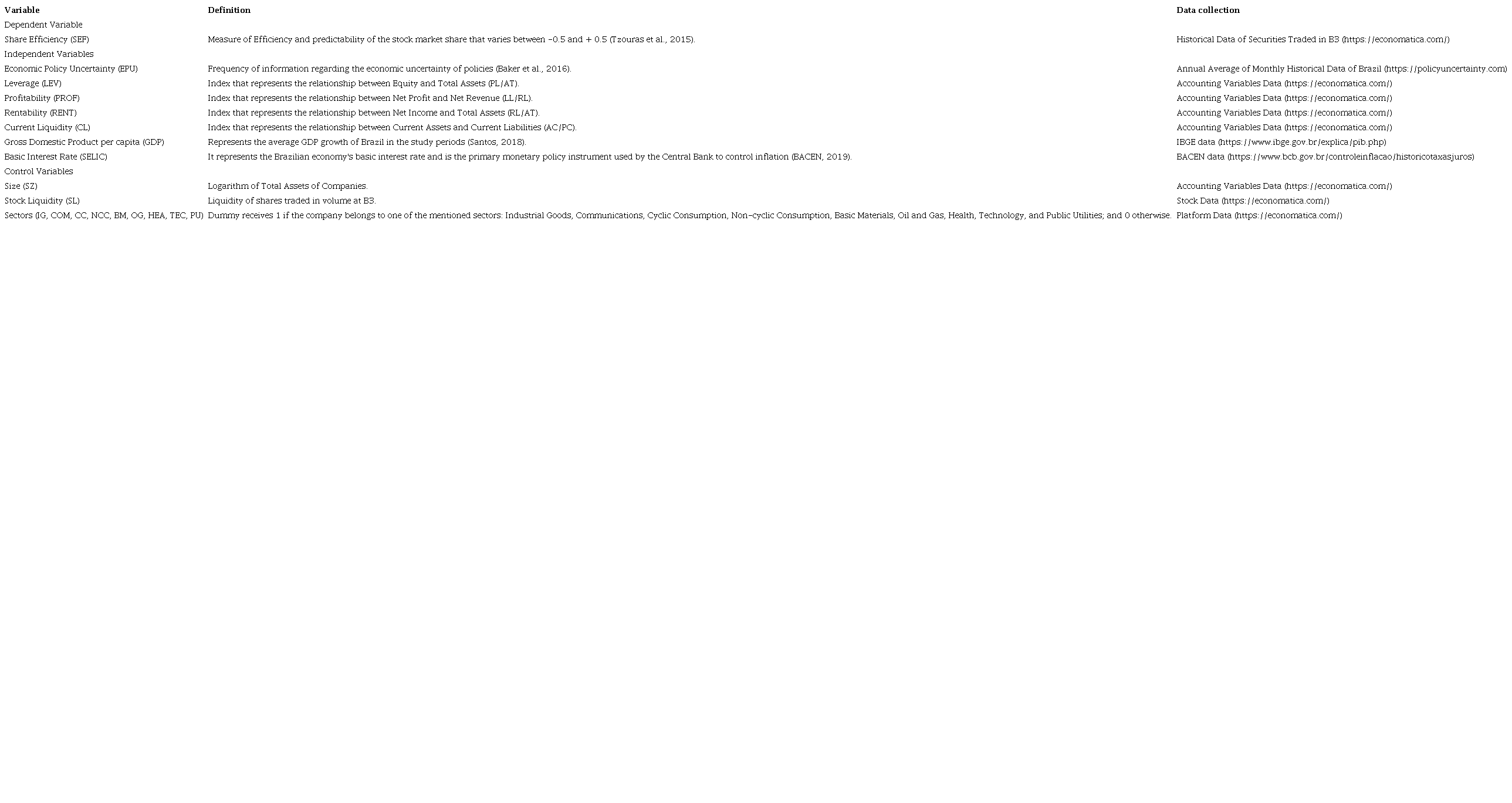 The independent variables, which aim to explain the levels of efficiency in the predictability of return on securities, are divided into three prisms: levels of political uncertainty, as represented by the variable Economic Policy Uncertainty (EPU); accounting indicators, represented by the variables Leverage (LEV), Profitability (PROF), Rentability (RENT) and Current Liquidity (CL); and macroeconomic environment, represented by the Gross Domestic Product (GDP) per capita and Basic Interest Rate, represented by the Special System of Settlement and Custody (SELIC). Additionally, we used control variables regarding Size (SZ), Stock Liquidity (SL), and the companies' sectors. The sectors used were: Industrial Goods (IG), Communications (COM), Cyclic Consumption (CC), Non-cyclic Consumption (NCC), Basic Materials (BM), Oil and Gas (OG), Health (HEA), Technology (TEC) and Public Utility (PU). For the other companies belonging to the "Others" sector, we no created a specific dummy.