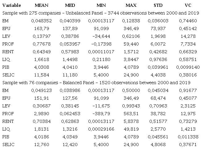 The variables that represent the country's macroeconomic environment, throughout the sample, have similar means between the samples since both comprise the same period, and low variability if observed the coefficient of variation.