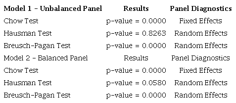 This research provides results for two regressions, which represent two different samples. We provided the results of the validation tests for these models. The Chow test compares Grouped MQO with Fixed Effects, the Breusch-Pagan test compares Grouped MQO with Random Effects, and the Hausman test compares Random Effects with Fixed Effects. Table 3 provides the statistical test results for the two regression models used in the study and the most appropriate panel diagnosis for each model.