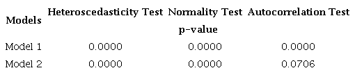Finally, in the autocorrelation test, in Model 1, the null hypothesis of first-order noncorrelation was rejected; in Model 2, we rejected this hypothesis. Thus, only in the second model is it that the residues are not related to each other. For the first model, it was necessary to use the HAC matrix for the correction of autocorrelation.