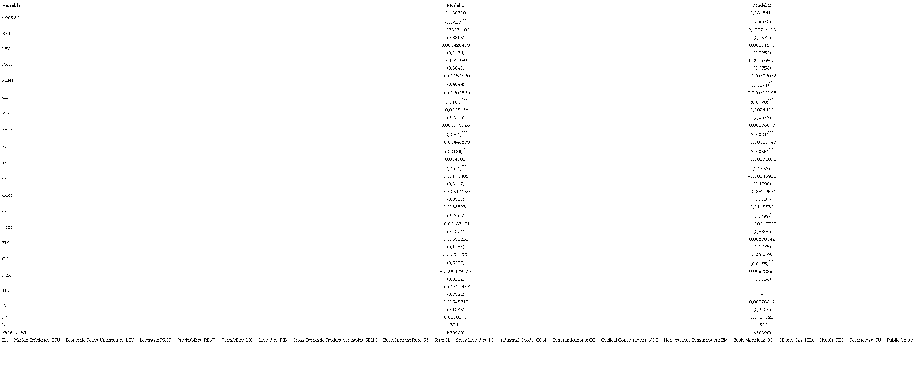 Control variables also showed statistical significance with the efficiency of the securities. Both Size (SZ) and Stock Liquidity (SL) contribute to the greater market efficiency. I.e., large companies and companies with more liquid stocks in the Brazilian market tend to have greater efficiency in their securities reported to the Brazilian capital market.