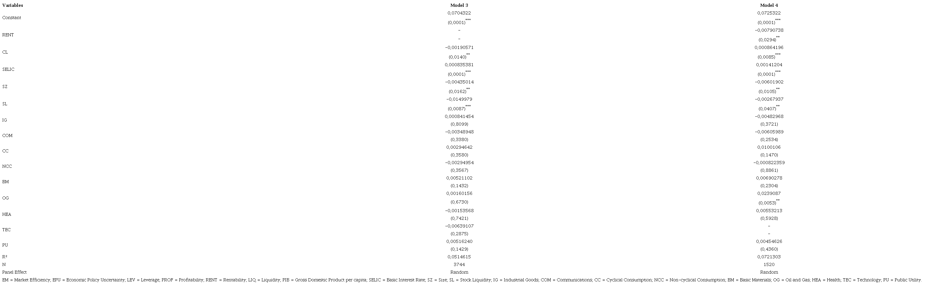 Finally, the variables that represent aspects of the macroeconomic environment were also significant in explaining the efficiency of the shares issued by Brazilian companies. SELIC is positively associated with the low efficiency of companies. In periods in which the interest rate is high, the securities traded in B3 are less efficient in predicting their returns.