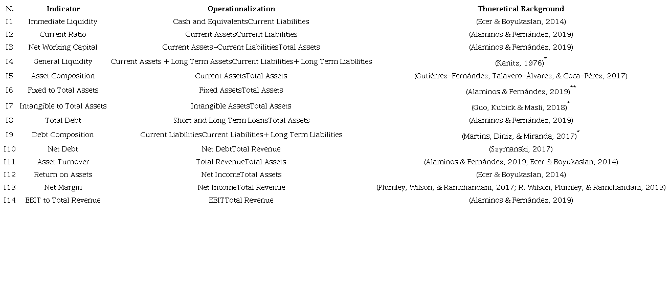 Including financial indicators, we intend to analyze the liquidity, indebtedness, return on investment, and profitability of football clubs. It is assumed that insolvent clubs present indicators at different levels from those presented by solvent clubs. We emphasize that indicators that directly or indirectly use the net equity were not included, as it is related to the insolvency criterion adopted in this study. Table 2 presents the selected indicators.