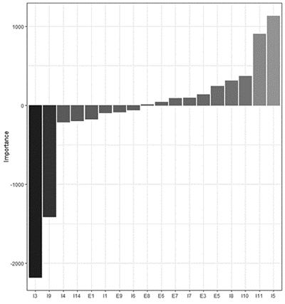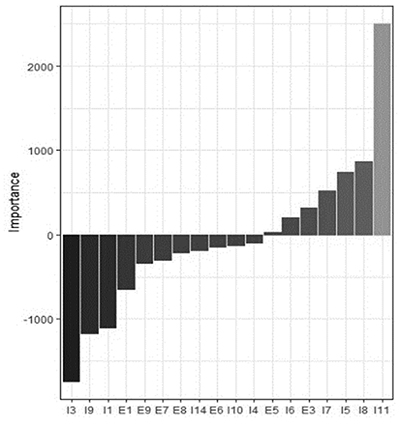 For model t-2, according to Figure 3, the variables net working capital (I3), debt composition (I9), and the asset turnover (I11) again proved to be important for the model, consistent with the results from model t-1. Distinctly, the asset composition variable (I5) proved to be important for the model. This result indicates that clubs that hold a higher value for intangible and fixed assets, proportionally in relation to total assets, move away from insolvency. The results of Alaminos and Fernández (2019) suggest that only financial variables were relevant for the t-2 model, most notably liquidity and debt variables.
