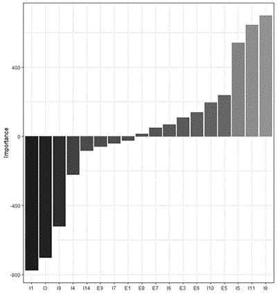 Through Spearman’s method, a correlation greater than 0.7 is shown between variables I2 and I4, I12 and I13, I2 and I14, I13 and I14, E2 and E4. Additionally, variables E1 and E2; E1 and E4 show a correlation of less than -0.7. Thus, it was necessary to exclude some variables. For the model development, variables I2, I12, I13, E2, and E4 were excluded - as these presented a higher correlation with other used variables - in order to reduce the redundancy of the model.