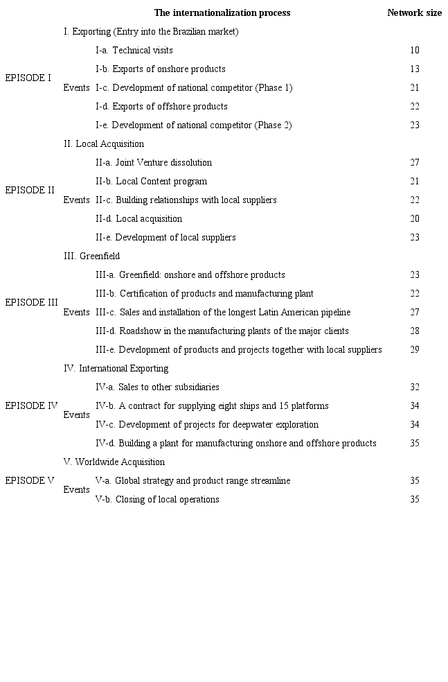 Thus, we initiated the interviews by asking the individuals to talk about the internationalization process of OilTubs in the Brazilian market. Not all individuals had full knowledge of the entire process. Hence, they were encouraged to give details about the events they knew most. Next, we presented a figure showing the internationalization process of OilTubs and asked for critical comments. Interestingly, they added no event, which means that the figure was an accurate visual portrait of the internationalization process of OilTubs in the Brazilian market. Finally, we asked the interviewees to identify the business and nonbusiness actors that participated in each critical event. For each nominated actor, we asked for details of her participation.