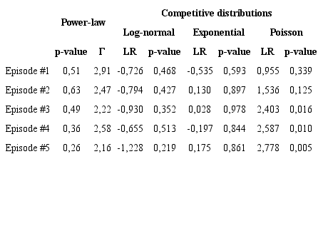 Table 3 shows that the p-values are only statistically significant for the Poisson distribution in the episodes #3 (p=0.06; p<0.10), #4 (p=0.010; p<0.10), and #5 (p=0.005; p<0.10). However, the values of LR are positive, thus favoring the power-law distribution. Also, all log-normal distribution LR values are negative, indicating that such distribution would be a better distribution for the network. However, the p-values are not statistically significant. Therefore, the paper’s results evidence that the evolution of OilTubs in the Brazilian nicely fits the power-law distribution with few actors accumulating a disproportional number of relationships.