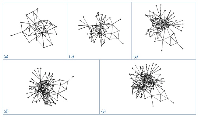 Figure 1 shows the network topology in the five episodes of the internationalization of OilTubs in the Brazilian market. Note that the network became larger in terms of the number of actors. However, it also became sparser. Interestingly, this result is similar to Coviello’s (2006) when studying the evolution of software firms’ dyadic relationships.